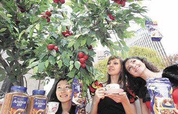 18日,东西食品公司在首尔中区小公洞乐天百货商店总店露天广场举行原豆咖啡“Maxim Arabica 100”试饮会,外国模特正在模型咖啡树下进行宣传活动。