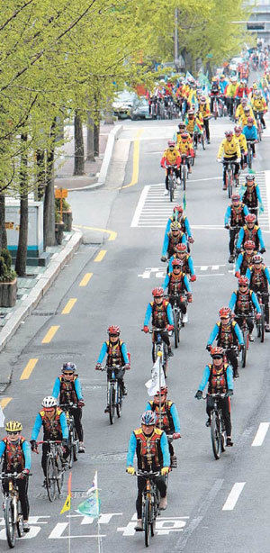 22日迎来第37届地球日,“绿色交通组织”成员等400余名市民骑上自行车,排成两行正从首尔汝矣岛前往活动举办地钟路区大学路。他们向市民宣传说,为了减少温室效应气体的排放量,防止地球变暖,尽可能利用大众交通工具和自行车出行。