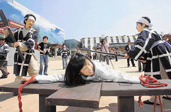 作为28日开幕的首尔文化节(Hi Seoul Festival)活动的一环,首尔钟路区斋洞小学的操场上重现了朝鲜时代的捕盗厅。在活动开幕前一天的27日,一名小学生正在已经准备好的刑架上体验棍杖刑。