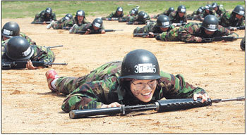 2日,光州大光女子高中学生在陆军第31师团新兵训练队举行的军营体验中,正在学习匍匐姿势。虽然学生们感到很辛苦,但脸上都带着少女特有的快乐笑容。大光高中从2001年开始进行军营体验活动,今年已经是第7个年头。
