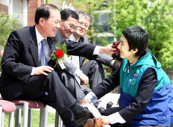 “谢谢老师。”在距教师节还有5天的10日,首尔江西区加阳洞东洋工业高中(音)青少年红十字会(RCY)的学生正在给老师擦皮鞋,以此表达尊敬和感谢之意。