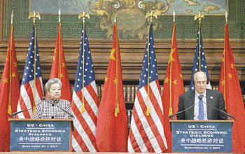 在美国华盛顿举行的为期两天的第二次中美战略经济对话于23日闭幕。图为,会后中国代表、副总理吴仪(左)和美国代表、财长保尔森正在举行共同记者会。因为对人民币汇率调整问题等很多问题未能达成一致,两人表情木然。