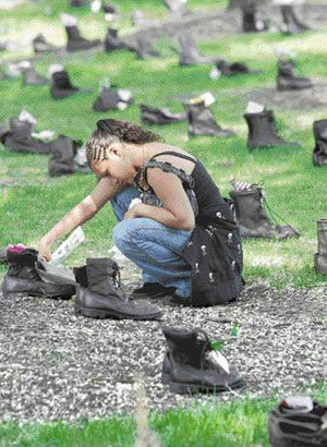 本月24日,迎来美军阵亡官兵纪念周末,在芝加哥格兰特公园,展出了3500多双军靴。以“请睁大眼睛:伊拉克战争阵亡者”为主题的该活动中展示的军靴上写有伊拉克战争阵亡者的名字。