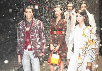 28日上午,在首尔钟路区平昌洞首尔展览中心举行的“DARS 2007秋冬艺术服装展”上,模特们正在“风雪交加”的冬季舞台上展示今年秋冬季节的流行服饰。