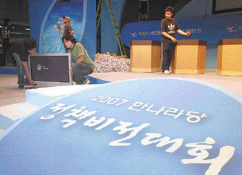 28日,光州5·18纪念文化馆民主大厅的工作人员正在布置背景并安装现场直播设备。因为,这里将举行对参加大国家党大选候选人竞选战的候选人进行政策验证的政策、展望大会。