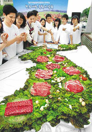25日,到首尔永登浦区汝矣岛洞参加“韩牛之爱国会品尝会”的人士正在观察用韩牛肉制成的韩半岛地图。本次活动是在美国牛肉正式投放市场的情况下,由全国韩牛农家组织韩牛自筹金理委员会承办的,邀请了国会农林海洋水产委员会委员等人士。