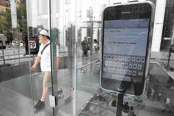 图为,在美国纽约的繁华大街第五大街上的苹果卖场内展示的“iPhone”大型模型。计划于今年下半年上市的“iPhone”不仅具有手机的各种功能,而且还具有便携式多媒体播放器(PMP)、MP3播放器、移动PC等的功能,因此成为人们谈论的焦点。