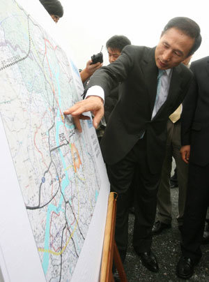 2日上午,访问全南罗州市金川面“光州、全南共同革新城市”推进现场的前首尔市市长李明博在视察完事业现状后,正在浏览开发计划案。李明博当天在全南、全北地区表示:“从这里走出去的政治家很多,但他们做了什么?”强调自己才是推动湖南经济发展的最合适人选。