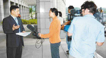 国防部海外派兵组组长金荣植(左)23日在首尔龙山区国防部办公楼内接受了阿拉伯地区的卫星电视台半岛电视台的采访。金荣植表示:“被派往阿富汗的韩国军队不是战斗部队,而是履行医疗和重建援助任务的部队。”并呼吁塔利班武装组织安全释放被绑架的23名韩国人。