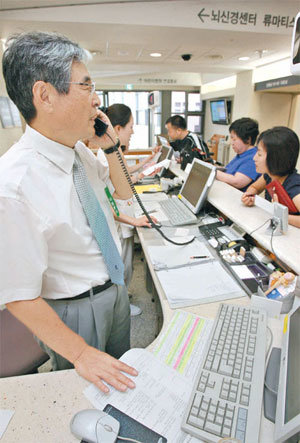 1日是首尔西大门区新村的大学医院隔离医院罢工的第23天。此医院预防医学科的金汉中教授在对外接收窗替罢工的职员们接电话。延世医院在上个月的30号向中央劳动委员会发表封锁单位的报告后,正在设法阻止参加罢工的劳动组合员在医院内引起的纠纷。