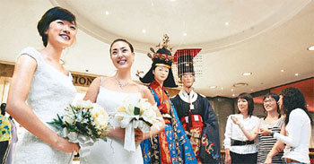 14日首尔江南区狎鸥亭洞现代百货开办的婚礼展示会上,顾客们参观了各种各样的婚纱和皇室大礼服。 现代百货到19日为止在狎鸥亭洞本店等全卖场进行婚纱展示会的同时还进行了对婚礼的咨询和新房装修的咨询。
