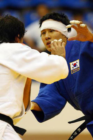 去年9月得到蒙古东亚选手大赛冠军的金民奎,参加16强赛时被俄罗斯选手撞到头部,靠近左眼的面布受伤,在这种情况下最终也夺得了冠军。