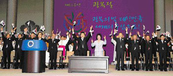 15日上午,卢武铉总统和夫人权良淑女士,在首尔世宗文化会馆大剧场举行的第62周年光复节庆典上,与来宾们共同高喊万岁。
