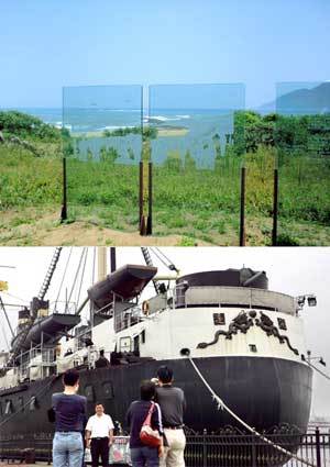 (왼쪽) 1895년에 일본군이 상륙한 대만 동북부의 아우디() 해변이다. 유리로 된 설명 판에는 상륙 시 사진의 설명이 새겨져 있었다. 해변으로 상륙해 오는 일본군의 망령을 보는 듯하다=이소가와() 촬영