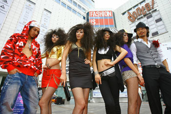 30日,在首尔中区斗山大厦前举行的“2007东大门时装庆典——游击战款式时装秀”上,男女模特们正在展示性感主题的服饰。下个月6日开始,为期两天的“东大门时装庆典”,是东大门的大型零售批发商家为了启动东大门商业圈而举办的。