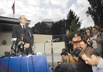 美国亚太事务助理国务卿克里斯托弗.希尔(Christopher R. Hill)1日在瑞士日内瓦美国代表部召开的北朝鲜与美国关系正常化2次会议结束后正在向记者说明结果。