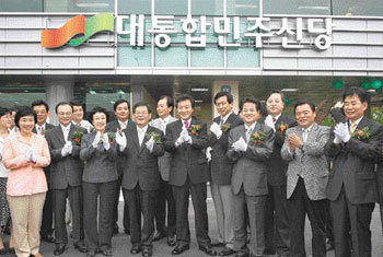 大统合民主新党吴忠一代表(从左起第四位)和大选竞选候选人于2日首尔永登浦区唐山洞的新祠堂里进行挂匾剪彩。