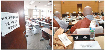 4日,釜山新罗大学人文科教室(左)和在首尔都染洞的韩国佛教历史文化纪念馆召开的第174届曹溪宗中央宗会临时会长章允先生的坐席,由于前秘书长郑允在和釜山建设单位金相振的各种嫌疑事件,出现空缺。