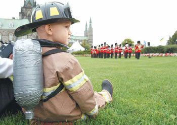 穿着消防员衣服的两岁左右的小孩,观看着9日为殉职的消防员们在加拿大渥太华举行的追悼仪式。这个小孩的爸爸也是安大略省工作的一位消防员。
