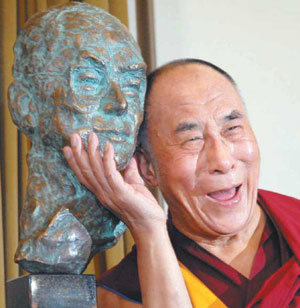 20日,访问德国北部城市明期特的西藏佛教精神领袖达赖喇嘛,对着位于明期特市厅自己的雕像愉快地笑着。达赖喇嘛曾在明期特大学得过名誉博士学位。