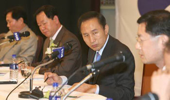 大国家党大选候选人李明博,23日参加在首尔西焦区羽面洞韩国教员团体总联合会召开的教育政策讨论会上,聆听参会者的发言。