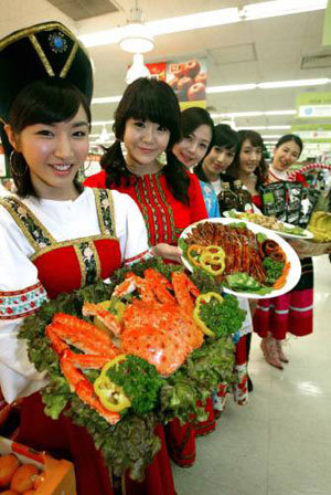 4日,新世界易买得首尔龙山驿站召开了展示各国优秀商品的海外展销会。身穿相应国家传统服饰的服务人员,正展示俄罗斯的王蟹、挪威的鲢鱼、秘鲁的鳗鱼等各国特产。此次展销会是为纪念易买得开业14周年而举办的,并在全国易买得店铺开展到8日结止。
