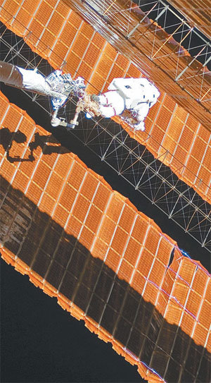 3日,宇宙人正在给悬挂在国际宇宙空间站(ISS)的机器人胳膊修理被破坏的太阳电池板。上个月30日被破坏的太阳电池板,成功地被宇宙人修理好了,因此,美国航空宇宙(NASA)表示,ISS的电力供给可以正常化了。