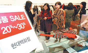 25日,光顾首尔江南区狎鸥亭洞现代商场总店的顾客们,在甩卖名牌商标售货处选购着多种多样的冬装。从下个月的5日起,首尔市内的主要商场全部开展持续5天的冬季大甩卖活动。