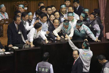 7日在台湾立法院,民进党议员们抢夺国民党王金平立法院长(中间)的议事棒,并阻止进行会议。明年3月份将举行总统选拔,他们是为了制定有关中央选举委员会的构成法律而引起纷争。