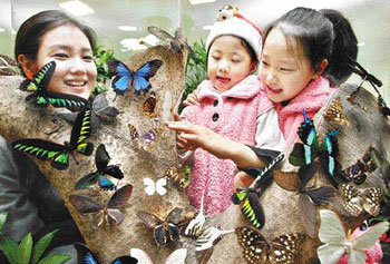 23日,在首尔松坡区的乐天“自然生态体验馆”吸引了很多儿童来参观蝴蝶。在这儿可以看到蝴蝶和昆虫,淡水鱼等各种自然生物,只要是乐天的入场顾客都可以免费观赏。