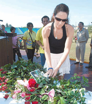 26日,英国人德罗斯-威肯森在泰国蔻立举办的地震海啸(tsunami)三周年追悼会上,在祭坛献上红玫瑰。威肯森和她的父母,男友一起在泰国度假时遇到海啸,她是唯一幸存者。