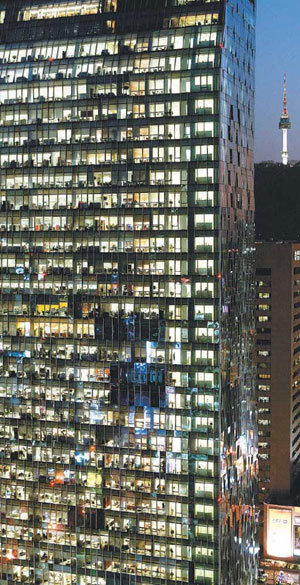 因结束年底业务而繁忙的职场人,办公室云集的城中心大厦每天都好似不夜城般通明。27日,从首尔中区新韩银行广交营业部楼顶上看到的乙支路SK通讯主楼。整幢楼灯火辉煌,因此找关着灯的办公室更为快捷。