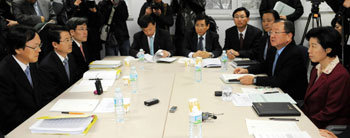 3日,李庆淑(右)总统职务接管委员会委员长和姜万洙(右边第2个)经济1分科干事等接管管理者们,在首尔三清洞接管委员会办公室听取金融监督委员会负责人们的业务报告。