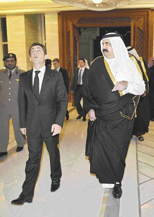14日,正在塔卡尔进行为期两天的正式访问的法国总统尼古拉•萨科齐(左),在埃米尔哈马德巴林国王的介绍下参观位于都哈的Doha Emiri Diwan Palace皇宫。