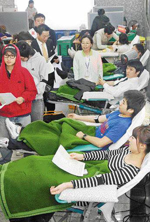 输血用血液不足已成为了社会性问题。18日,设在首尔市内某百货商店的献血所,市民们正在排队献血。当天,百货大楼举办了对当天献血的人们发放时装优惠购物券的“爱心献血活动”。