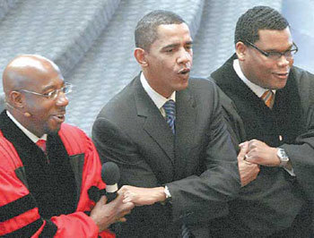 버락 오바마(가운데) 미국 민주당 대선 예비후보가 20일 미국 조지아 주 애틀랜타의 에벤에셀침례교회에서 목회자들과 손을 잡고 찬송가 우리 승리하리라(We Shall Overcome)를 부르고 있다. 이 노래는 흑인 인권운동가 마틴 루서 킹 목사가 대중 집회에서 자주 부르던 찬송가다.