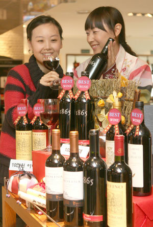 23日,为迎接春节的到来,首尔中区小公洞的乐天百货大楼总部将价值9万-30万韩元的香槟礼盒作为赠品。