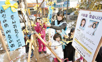京畿的小学生李惠珍(10岁)和吴伊朱(8岁)距今已失踪有一个多月了。25日京畿的YMCA人员和小孩子们在大树上挂满了黄色蝴蝶结,并祈祷着两位小朋友的归来。