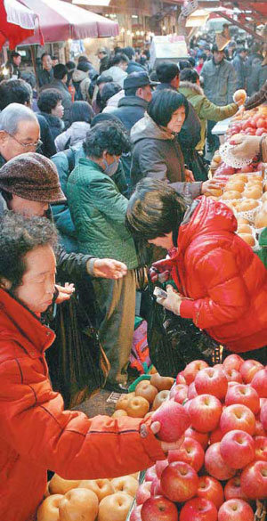 “大叔,再便宜点吧”,3日的市场里挤满了讨价还价的客户和商人们。不管天气多么寒冷,为了购买拜祭祖先的食物来到市场采购的人们还是人山人海。