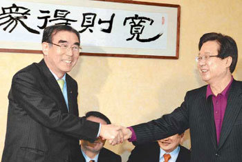 2日,大国家党事务总长李方鎬(左)与党的最高委员一同访问了京畿城南市分党区姜在涉代表的住宅,对总选推荐内讧事态表示了歉意后与姜代表亲切握手。