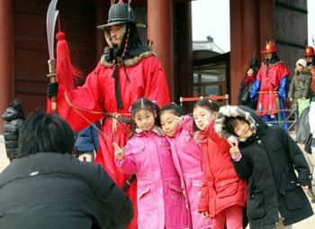春节假期最后一天的10日,小孩子们在首尔景福宫兴礼门前以严肃的表情守备的军人旁,正做出有趣的表情照相。