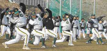 但是看来选手们的心情还是不错的。因为一直都在京畿高阳市原堂棒球场进行室内训练,这是第一次的室外训练。从当天下午两点开始,选手们进行了两个多小时的热身和接球等训练。