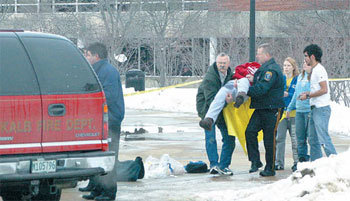 14日,在美国伊利诺州迪卡布北伊利诺伊大学(NIU)校内,救护人员正把在枪击事件中受伤的学生送往医院。在这次事件中有5名学生死亡,16名受伤。照片是由NIU学生发行的《北极星》提供。