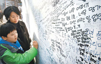 15일 국보1호인 숭례문 화재 현장을 찾은 한 초등학생이 임시로 만들어진 게시판에 국보 1호를 잃은 안타까운 심정을 적고 있다.