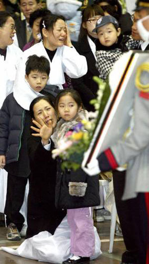 在直升机坠入事件中殉职的7名将兵葬礼22日上午在京畿城南市的国军首都医院进行。故沈继永的夫人抱着女儿大声痛哭。