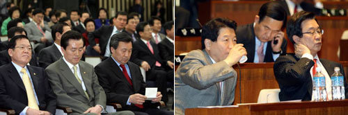 26日,国会本会议前召开的党议员总会中,统一民主党孙鹤圭共同代表(右)和金孝锡院内代表等正围绕韩昇洙国务总理候选人的批准问题而苦恼。
