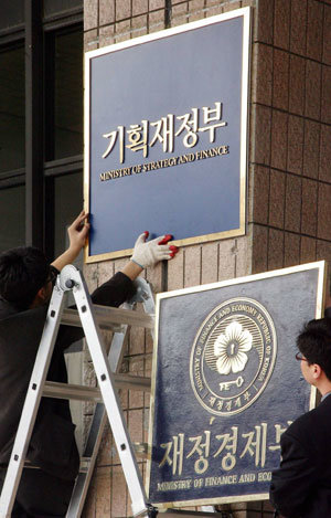 29日京畿中央大厦第一栋,职员们正把财政经济部的牌匾换成企划财政部的牌匾。