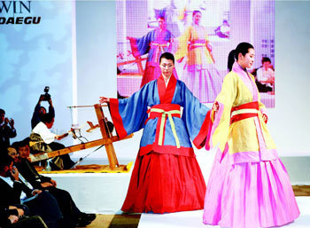 12日在大邱举办了“2008大邱国际纤维博览会”,博览会中sillayeomgung财团法人用天然染色的布料、自社设计的服装表演了服装秀。此博览会将于14日结束。
