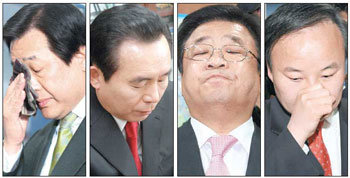 4/9总选开始之际,大国家党和统一民主党的推荐活动中出现了诸多大人物的脱离。图为14日上午在大国家党离党记者会上流泪的金茂城议,对推荐螺旋表示不满的李仁济统一民主党议员,为了要求推荐选举再议找到大国家本社的权哲贤议员,表示恢复从推荐结果的金在源大国家议员(从左到右)。