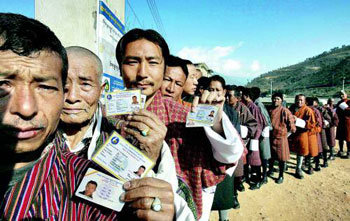 24日,被称为“隐秘王国”的喜马拉雅山脉上的小国不丹,根据英国留学派出身的吉格梅•凯萨尔•旺楚克国王的指示,结束了100年历史的王政,实施了为引进民主主义体制的首次下议员选举。首都廷布某投票站前,手持身份证的投票人排起了长队。